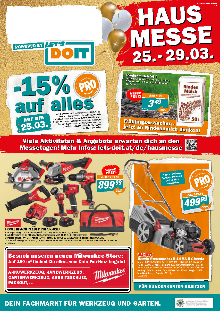 Und wer bis Samstag mittags noch immer nicht genug oder noch keine Zeit hatte: das gesamte Hausmesse-Sortiment kannst Du auch von daheim bis Sonntag abends online-shoppen. Wir wünschen viel Erfolg & Vergnügen und freuen uns auf Deinen Besuch, Wolfgang Fabris & das Team vom Purgstaller Let´s DOIT